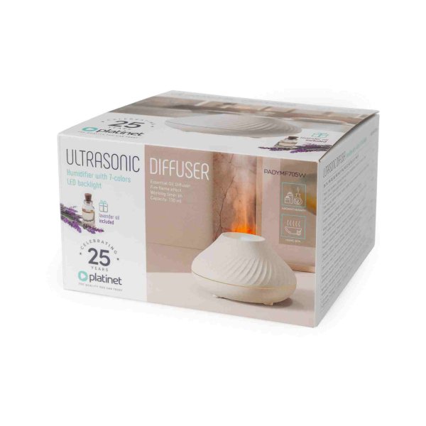 Flame Aroma Diffuser je moderní zařízení, které kombinuje funkci zvlhčovače vzduchu a elegantní světelný efekt simulující plamen. Díky inovativní ultrazvukové technologii rozptyluje jemnou zvlhčující mlhu a naplňuje místnost relaxační vůní vašich oblíbených esenciálních olejů. Vestavěné LED podsvícení v sedmi barvách vám umožní přizpůsobit náladu vaší pohodě a vytvořit atmosféru tepla a klidu.