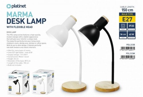 Stolní lampa PDL333 je stylový model s dekorativními prvky, který kombinuje kovovou konstrukci a dřevěnou základnu. Je k dostání v bílé i černé variantě. Díky klasickému závitu E27 si uživatel může zvolit vlastní žárovku až do výkonu 40 W podle preferované barvy a intenzity světla. Lampa vyniká jednoduchým tvarem a přírodním materiálem, což ji předurčuje pro použití v domácnostech, kancelářích nebo kavárnách.