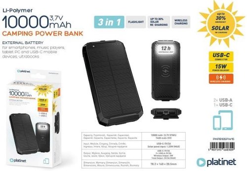PLATINET POWERBANK 10000 mAh SOLAR PANEL WIRELESS CHARGER 15W 2X USB-A, 1X USB-C