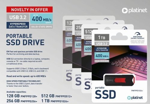 Přenosný USB disk Platinet SSD Drive 128 GB poskytuje rychlý a stabilní přenos dat díky technologii USB 3.2 Gen 2. Je to ideální řešení pro přenos a ukládání velkých souborů, jako jsou filmy, fotografie nebo dokumenty.