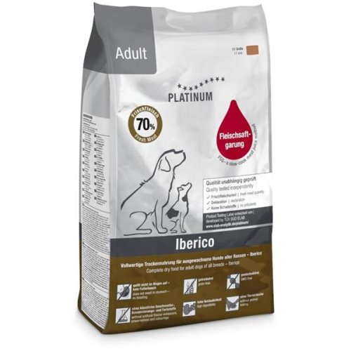 Polovlhké krmivo Platinum Adult Iberico je založené na iberském vepřovém mase, které patří mezi nejkvalitnější masa na světě. Má výraznou chuť, je šťavnaté, výživné a psi jeho chuť zbožňují. Iberská prasata jsou kříženci domácího a divokého prasete, proto se v jejich mase snoubí chuť zvěřiny s vepřovým. Pečlivě vyladěné složení navíc neobsahuje žádné obiloviny (grain-free), je přirozeně bezlepkové a hypoalergenní. Pochutnají si na něm psi s alergiemi na jiné druhy masa, psi v aktivní zátěži i vitální senioři. Receptura obsahuje také sušené rybí maso a lososový olej a má díky tomu vyvážený poměr omega-3 a omega-6 mastných kyselin. Díky jedinečné přípravě metodou Fleischsaftgarung (vaření ve vlastní šťávě ve vakuu za nízkých teplot) si navíc granule zachovávají důležité živiny, bohatou chuť i vůni. Granule jsou balené do alu-foliových pytlů, které zachovají čerstvost a vůni do posledního sousta. Hlavní přednosti: