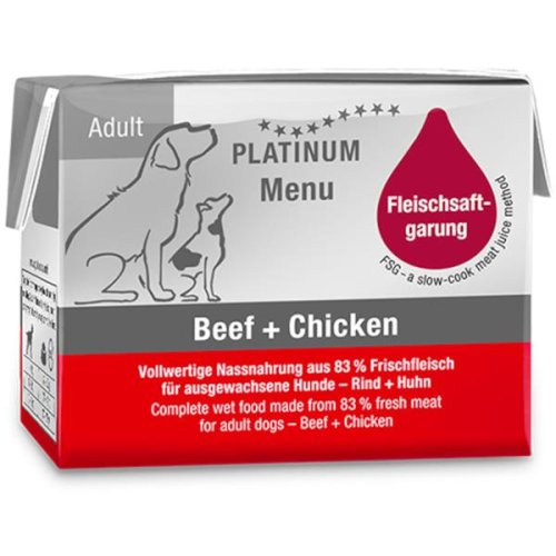 Paštika Platinum Menu Adult Beef + Chicken obsahuje 83 % čerstvého masa. Díky jedinečné metodě přípravy Fleischsaftgarung si maso uchová plnou chuť, vůni a všechny důležité živiny. Přísady se pomalu vaří za nízkých teplot uzavřené v obalu Tetra Recart. Všechna šťáva tak zůstane uvnitř, včetně vitamínů a minerálů. Receptura s vyváženým složením vyhovuje i psům s citlivým zažíváním. Hlavní přednosti: