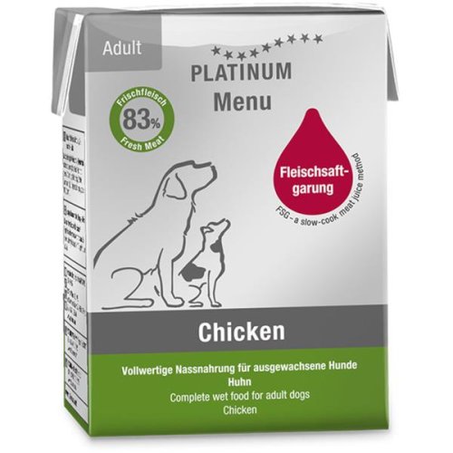 Paštika Platinum Menu Adult Chicken obsahuje 83 % čerstvého kuřecího masa. Díky jedinečné metodě přípravy Fleischsaftgarung si maso uchová plnou chuť, vůni a všechny důležité živiny. Přísady se pomalu vaří za nízkých teplot uzavřené v obalu Tetra Recart. Všechna šťáva tak zůstane uvnitř, včetně vitamínů a minerálů. Receptura s vyváženým složením vyhovuje i psům s citlivým zažíváním. Hlavní přednosti: