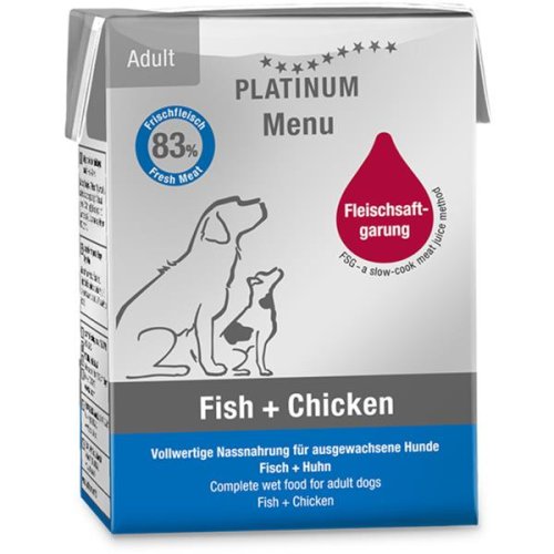 Paštika Platinum Menu Adult Fish + Chicken obsahuje 83 % čerstvého kuřecího a rybího masa z tuňáka a sardinek. Díky jedinečné metodě přípravy Fleischsaftgarung si maso uchová plnou chuť, vůni a všechny důležité živiny. Přísady se pomalu vaří za nízkých teplot uzavřené v obalu Tetra Recart. Všechna šťáva tak zůstane uvnitř, včetně vitamínů a minerálů. Receptura s vyváženým složením vyhovuje i psům s citlivým zažíváním. Hlavní přednosti:
