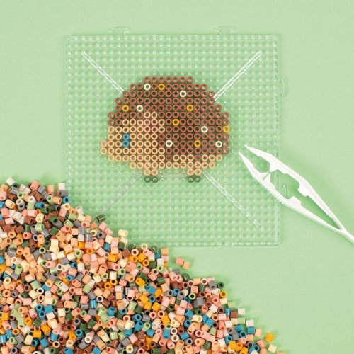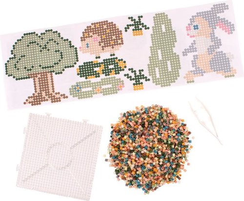 12 000 ks korálků v jemných pastelových barvách, destičk ve tvaru čtverce, barevné předlohy, zažehlovací papír, pinzetu.