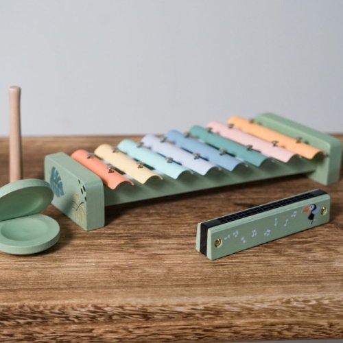 • obsahuje 4 hudební nástroje: xylofon, flétna, harmonika a kastaněty