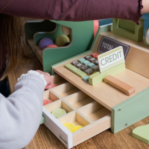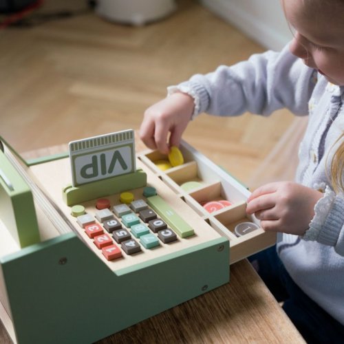 Stylová dřevěná pokladna přináší dětem autentický zážitek z prodeje i nakupování.