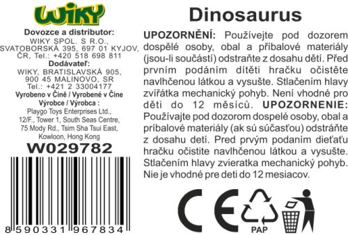 Dinosaurus. Velikost 13 cm. Natahovací - natažení se provádí zatlačením hlavy směrem dolů. Po uvolnění hlavy se dinosaurus rozjede.