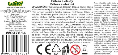 Playgo Fritéza s efekty 20cm. Obsahuje fritézu, hranolky, nugety, kečup, talíře. Tlačítka pro výběr programu. Po spuštění fritéza vevnitř svítí, zvuky smažení. 3xAAA baterie součástí.