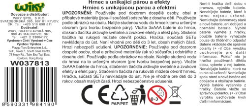 Hrnec s párou a efekty. Velikost 16cm. Obsahuje hrnec s poklicí a potravinami. Tlačítko aktivuje světlo, bublavý zvuk a studenou páru. Pro vytvoření páry je nutné nalít vodu do poklice k tomu určeným otvorem. Návod na krabici. Baterie součástí.