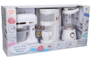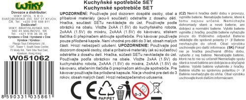 Kuchyňské spotřebiče set 3ks. Obsahuje mixér 20cm, kávovar 20cm a kuchyňský robot 16cm. 2xAA do kuchyňského robota a 2xAAA do mixéru, 2xAAA do kávovaru. Kávovar má nádržku na vodu, která protéká do hrnečku. mixér při podržení tlačítka mixuje, kuchyňský robot má přepínač na zapnutí a vypnutí šlehání.