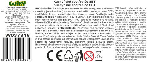 Playgo kuchyňské spotřebiče set 4ks. Obsahuje: varnou konvici, topinkovač, mixér a kuchyňský robot. Topinkovač po zatlačení páčky dolů a nastavení kolečka začne tikat a po uplynutí času topinky vyskočí. Mixér při držení stlačeného tlačítka mixuje. Kuchyňský robot po zapnutí tlačítka mixuje, po vypnutí se zastaví. Konvice vydává zvuk vařící se vody. Baterie 2xAAA (kuchyňský robot), 2xAA (mixér) a 2xAA (konvice). Baterie nejsou součástí balení.
