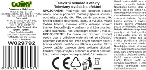 Televizní ovladač s efekty. Rozměry 5,5x3,5x14,5 cm. Zvukové efekty - zvuky, písně, angličtina. 2xAAA baterie součástí.