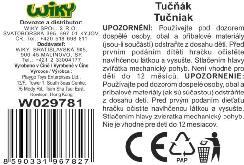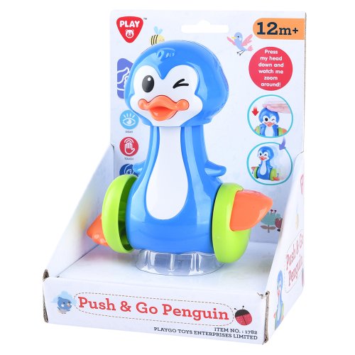 Tučňák. Velikost 13 cm. Natahovací - natažení zatlačením hlavy směrem dolů. Po uvolnění hlavy se tučňák rozjede.