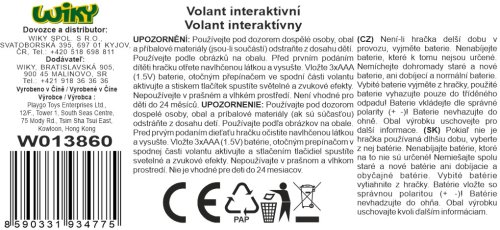 Zapnutí otočným spínačem na ve spodní části volantu. Zvukové a světelné efekty - klakson (tlačítko uprostřed), zvuky jízdy (řadící páka napravo), tóny a melodie ( malá tlačítka na volantu).