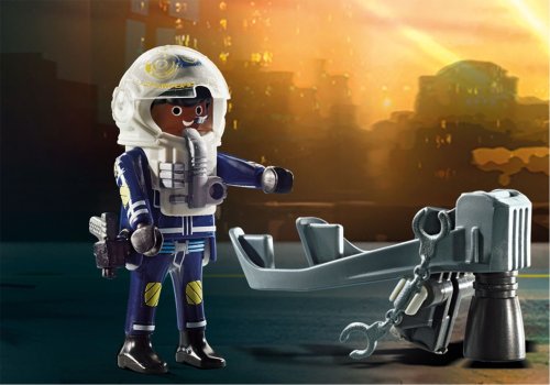 Policista s tryskovým batohem se blíží k zloději prchajícímu na motorovém člunu. Poplach ve městě! Někdo se vloupal do muzea. Nyní podezřelý prchá na člunu. Svůj ukradený lup ukryl ve spacáku. Přestože zloděj jede ve svém člunu rychle, chytrý policista PLAYMOBIL je již se svým jetpackem v akci. Důstojník se ve vzduchu rychle přiblíží k člunu a jedním skokem skočí na palubu. O několik minut později nasazuje zloději pouta. Cenné umělecké předměty jsou naštěstí nepoškozeny a lze je vrátit do muzea.