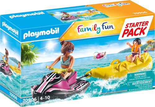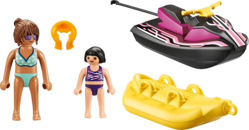 Vydejte se na projížďky na divokou vodu s vodním skútrem PLAYMOBIL. Holčička nadšeně sedí na banánovém člunu a maminka ji táhne na vodním skútru vlnami. Díky záchranné vestě je dívka v případě pádu do vody v bezpečí. Tento Starter pack je skvělým úvodem do rodinného a zábavného světa PLAYMOBIL.