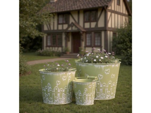 Tato sada tří oválných plechových květináčů s motivem Jaro a praktickým uchem je ideální pro výsadbu květin, bylinek nebo dekorativních aranžmá. Zelená barva a stylový design dodávají prostoru svěží a veselý nádech.