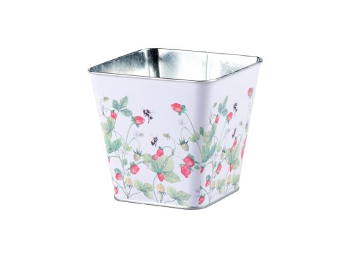 Hranatý plechový květináč s motivem jahod, ideální pro letní atmosféru. Jeho rozměry jsou 125x125x120mm.