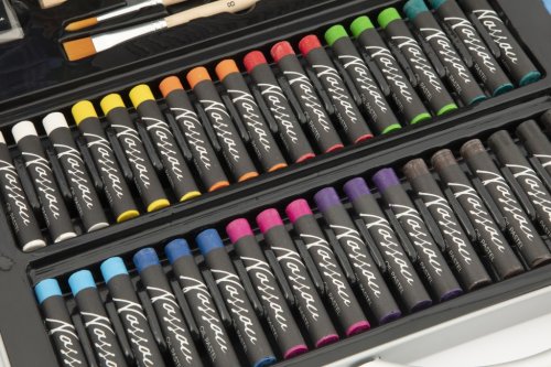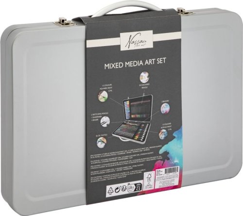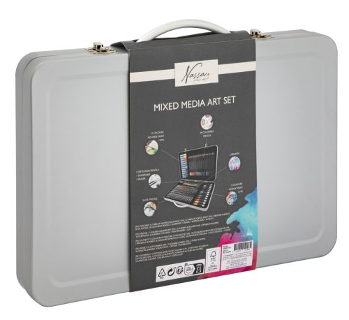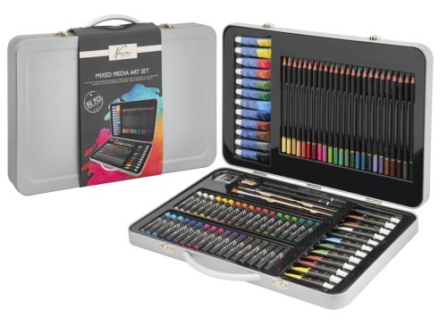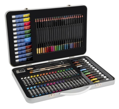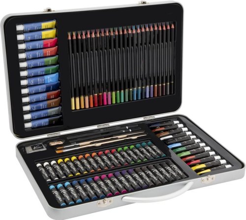 12 akvarelových barev 12 ml, 12 akrylových barev 12 ml, 24 pastelek, 2 štětce, 36 olejových pastelů, 2 skicovací tužky, ořezávátko, gumu.