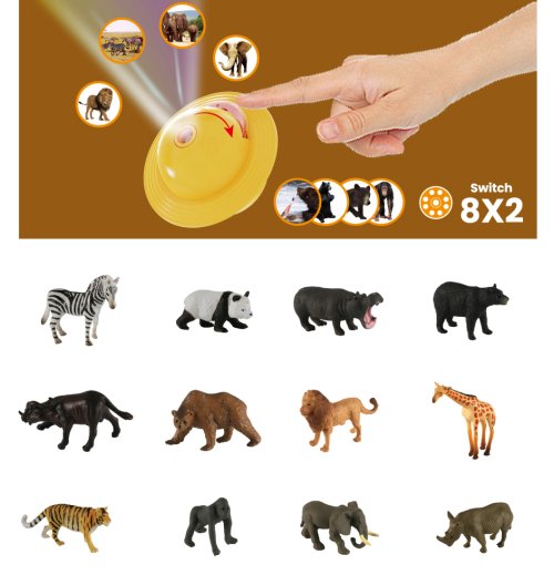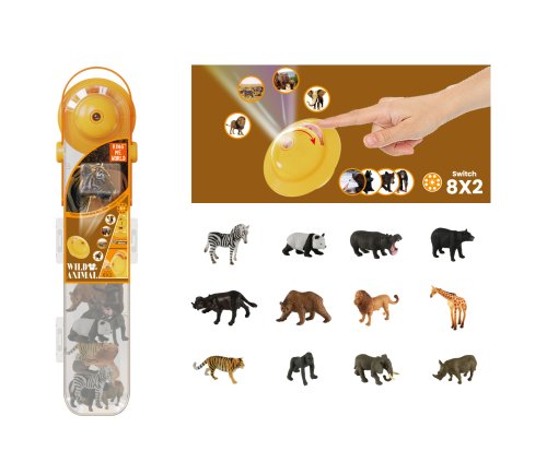 Projektor s divokými motivy: Hlavní součástí sady je projektor, který po vložení jednoho ze dvou přiložených kotoučů promítá na stěnu nebo strop obrázky divokých zvířat. Projektor je navržen tak, aby se dětem snadno ovládal. Každý kotouč obsahuje sadu barevných obrázků známých zvířat ze safari, jako je panda, lev, slon, hroch a další.