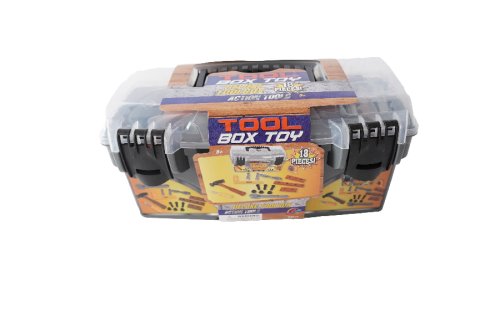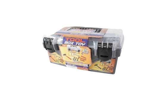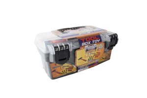 V tomto přenosném plastovém kufříku najdou děti vše potřebné: pilku, kleště, šroubovák, kladívko, a dokonce i šroubky, které lze použít k montování přiložených „prkýnek“.