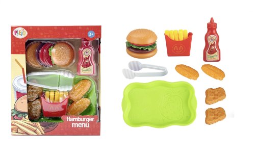V sadě najdete vše, co potřebujete k přípravě chutného hamburgeru, a často k němu i další dobroty, jako jsou třeba křupavé hranolky, kečup a výborné kousky kuřete. Díky tomu si děti mohou skvěle hrát na prodávání, nakupování nebo vaření.