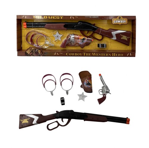 Sada obsahuje velkou pušku se zvuky, kolt s pouzdrem, ostruhy jako pro opravdového kovboje a šerifův odznak.