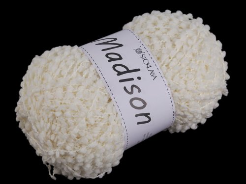 Příze Madison zaujme pozornost malými nopky, které dodají hotovému výrobku nevšednost. Můžete z ní uplést šály, svetříky, vesty apod. Velikost jehlic: 4 - 5 Pokud přízi budete párat, je nutné postupovat velice opatrně, aby se nepoškodila. Před pletením doporučujeme udělat zkušební vzorek.