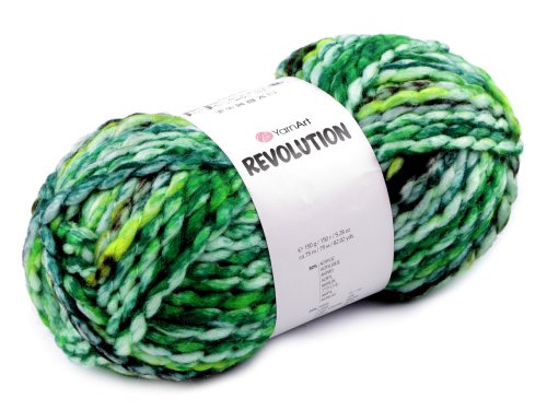 Melírovaná příze Revolution má velmi zajímavou strukturu. Je opletená přídavnou tenkou přízí, která vytváří originální efekt - jemné vlny. Díky podílu vlny je měkká a hřejivá. Můžete z ní vyrobit svetry, šály, vesty, čepice, plédy apod. Velikost jehlic: 9 Velikost háčku: 9