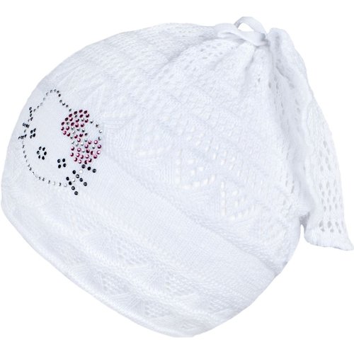 Jarní pletená čepička-šátek New Baby. Čepičku zdobí obrázek kočičky s třpytivými kamínky. Složení: 100% bavlna. Materiál je pružný. Obvod kolem hlavičky cca 40-50 cm.