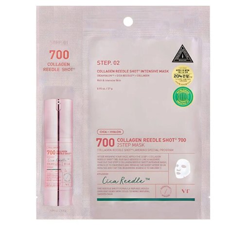 Dvoufázová maska Collagen Reedle Shot 700 spojuje sérum s mikrojehličkami a textilní masku pro intenzivní péči o pleť. Kombinace obou kroků podporuje hydrataci, zjemnění a vyhlazení struktury pokožky. Pomáhá obnovit jas pleti, zlepšit její pružnost a zmírnit viditelnost vrásek. Technologie Cica Reedle™ napomáhá hlubšímu vstřebávání aktivních látek a podporuje obnovu pleti. Složení s kolagenem, komplexem Cicahyalon™, ceramidy a mléčnými proteiny přispívá k hydrataci, zklidnění a posílení kožní bariéry. Pleť je po použití hladší, pevnější a viditelně revitalizovaná.