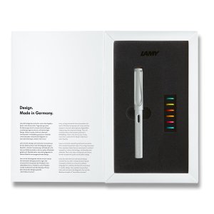 PLNICÍ PERO:, * ergonomicky upravená úchopová zóna, * odpružený kovový klip v bílé barvě, * nasazovací víčko, * souprava obsahuje pero LAMY safari a šest barevných kroužků, * možnost použití jak inkoustových bombiček, tak i plnění pera inkoustem z lahvičky, Dodáváno s jednou bombičkou.