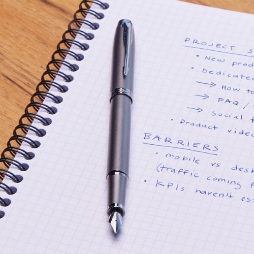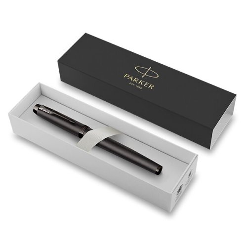 Plnicí pero:, * nasazovací víčko, * hrot z nerezové oceli zdobený jemnou rytinou, potažený leskle titanovou vrstvou , * přizpůsobeno výhradně k používání inkoustových bombiček Quink nebo konvertoru (není součástí balení), Dodáváno s modrou bombičkou, v elegantním dárkovém balení., V řadě IM Monochrome Parker opět využívá technologii PVD. Díky módnímu monochromatickému provedení a modernímu matnému designu je Parker IM Monochrome ideálním doplňkem pro mladou, generaci. Je elegantní i vysoce profesionální a spolehlivý., JAK SE LIŠÍ HROTY F A M?, F - Slabý hrot (Fine) - Vhodný pro běžné psaní a poznámky. Mírný tlak vytváří jemnou linku. Velmi oblíbený, vhodný pro uživatele se standardním rukopisem., M - Střední hrot (Medium) - Průměrný tlak a šíře linky. Vhodný pro uživatele, kteří mají rádi maličko silnější linku.,