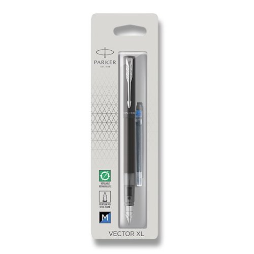 PLNICÍ PERO:, * nasazovací víčko, * hrot z nerezové oceli zdobený jemnou rytinou, * dvoukanálkový systém zásobování hrotu inkoustem, * přizpůsobeno výhradně k používání inkoustových bombiček QUINK nebo konvertoru (není součástí balení), Dodáváno na blistru., Kolekce Vector XL se pyšní rysy typickými pro modelovou řadu Vector, pouze v provedení XL. Díky prověřenému mistrovství značky Parker je Vector psacím nástrojem, kterému lze beze zbytku, důvěřovat.