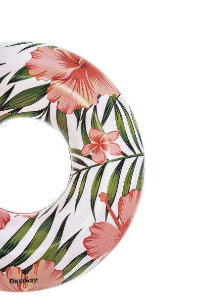 Design plovacího kola je velmi realistický a detailní, s výraznými květy hibiskusu a zelenými listy, které vytvářejí příjemnou tropickou atmosféru. Povrch kruhu je hladký a lesklý, což nejen zlepšuje estetický dojem, ale také usnadňuje čištění a údržbu. Kruh má klasický kruhový tvar s dostatečně širokým vnitřním otvorem, který umožňuje pohodlné sezení nebo plavání uvnitř kruhu.