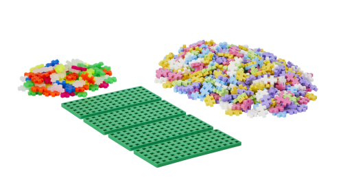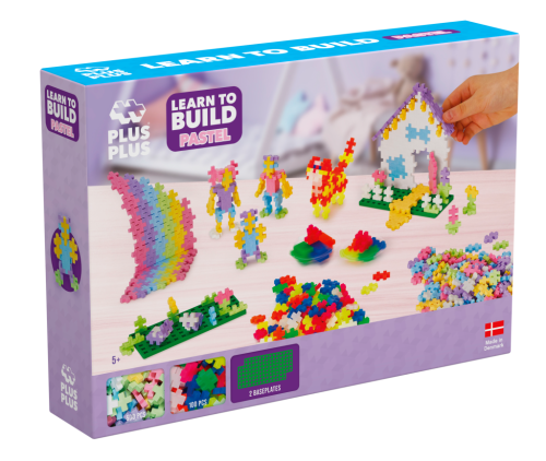 Kreativní sada PLUS-PLUS Nauč se stavět Pastel obsahuje 500 pastelových dílků, 100 dílků neonových a 4 malé základní desky. Podle návodu můžete vytvářet obrázkové mozaiky, ale i 3D modely – zvířata, postavy, budovy apod.