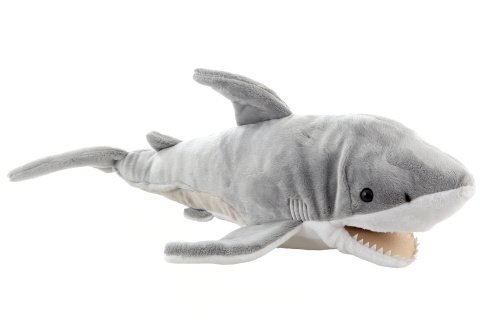 Plyšový žralok-maňásek. Ve spodní části prostor pro ruku, díky čemuž lze hýbat tlamou žraloka. Rozměry 46x20x26 s ploutvemi. Věk 0+