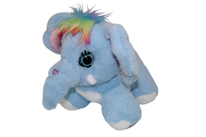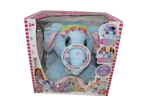 Plyšové slůně Lola je interaktivní hračka určená především pro malé děti od dvou let věku, která kombinuje hebkost plyšového materiálu s moderními funkcemi pro zábavu i rozvoj dítěte. Lola je vyrobena z jemného modrého plyše s růžovým vnitřkem uší a bílými detaily na tlapkách a kly, což jí dodává přátelský a přitažlivý vzhled. Na hlavě má navíc barevnou duhovou hřívu, která působí hravě a originálně.