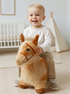 Plyšové nafukovací hopsadlo je zárukou dlouhotrvající zábavy pro Vaše dítě. Hopsadlo se pohodlně drží za uši a obsahuje zvukový modul, který po zmáčknutí mezi ušima vydává realistický zvuk koníka. Je potaženo plyšovým materiálem, který je příjemný na dotek a neklouže. Součástí balení je pumpička k pohodlnému nafouknutí a baterie (3xLR44).