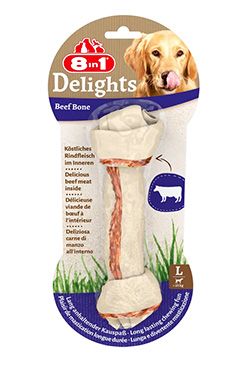 Žvýkací kosti Delight 8in1 jsou velmi lahodné. Díky kombinaci surové kůže a chutného masa uprostřed uspokojí přirozený instinkt psa žvýkat a zároveň procvičují čelistní svalstvo. Pamlsky pro psy podávejte jako odměnu, motivaci nebo jako zpěstření běžné stravy. Žvýkací kost je obohacena o minerály a uvnitř je sušené hovězí maso. Kosti z hovězím masem jsou bohaté na bílkoviny. Ideální pamlsek pro přecitlivělého nebo alergického psa.