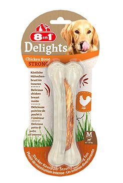 Extra pevné žvýkací kostičky 8in1 Delights Strong dlouho vydrží. Kuřecí maso je zabalené do velmi tvrdé prémiové surové kůže, která podporuje dentální péči. Pamlsky pro psy Delights S jsou vhodné pro menší a střední psy. Pravidelné žvýkání eliminuje tvorbu zubního plaku a kamene.