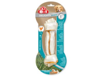 Žvýkací kost s mineráliemi a se sušeným kuřecím masem uvnitř, doplňkové krmivo pro dospělé psy od 20 do 40 kg hmotnosti.