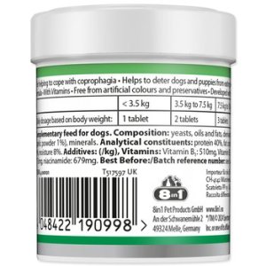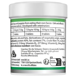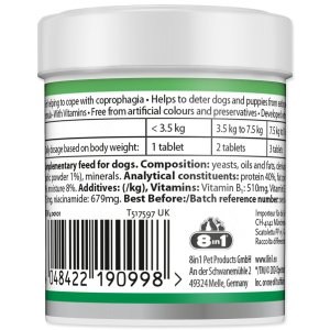 Tablety 8v1 Deter jsou ideálním denním doplňkem pro psy, který pomáhá zabránit a odradit je od konzumace vlastních výkalů (koprofágie). Vyvinuto ve spolupráci s veterináři, obsahuje kvasnice, rybí oleje, zeleninu a širokou škálu vitamínů a minerálů. Tablety 8v1 Deter jsou určeny pro psy a štěňata a bez umělých barviv a konzervantů. Produkt je vyroben v Německu.