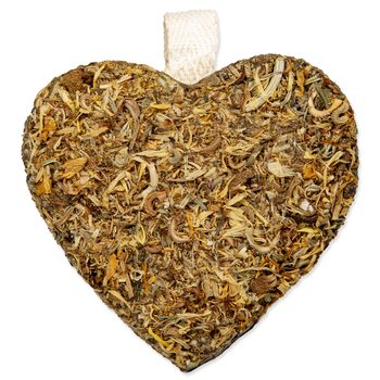 Bezobilné doplňkové krmivo pro králíky a hlodavce. Tento přírodní bezobilný pamlsek ve tvaru srdíčka je posypán okvětními lístky měsíčku lékařského, který je dlouhé roky používán jako léčivá bylina. Sušená zelenina a další přidané bylinky mají nejen vysokou chutnost, ale také blahodárný vliv zdraví a zažívání. Díky absenci zrnin je tento přírodní pamlsek vhodný také pro králíky, morčata i činčily. Díky bavlněnému provázku můžete srdíčko přivázat do ubikace na oblíbené místo vašeho mazlíčka.