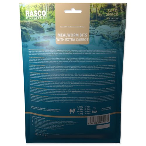 Mouční červi 68,5%, mrkev 15%, rostlinná bílkovina 5%, kukuřičný škrob 5%, pšeničná mouka 3%, glycerin 3%, sůl 0,4%, sorbát draselný 0,1%.