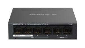 6portový stolní switch 10/100 Mb/s se 4 porty PoE+ 6 portů: 6× 10/100 Mbps RJ45 portů se 4 porty PoE+.