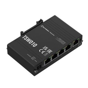 Teltonika TSW010; Průmyslový switch bez managementu nabízející pět RJ-45 portů (10/100 Mbps).