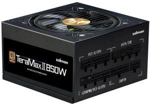 ZALMAN TeraMax II 850 W; Napájecí zdroj osazen tichým 120 mm ventilátorem. Účinnost zdroje splňuje certifikaci 80PLUS Gold.
