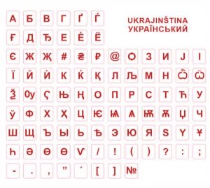 Ukrajinská přelepka na klávesnici - červená *Červená barva písma a průhledné pozadí přelepů *Přelepka vhodná na nalepení na světlou klávesnici s černým písmem *Azbuka s kompletní sadou znaků používanou …
